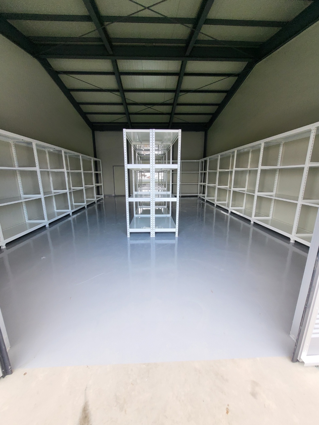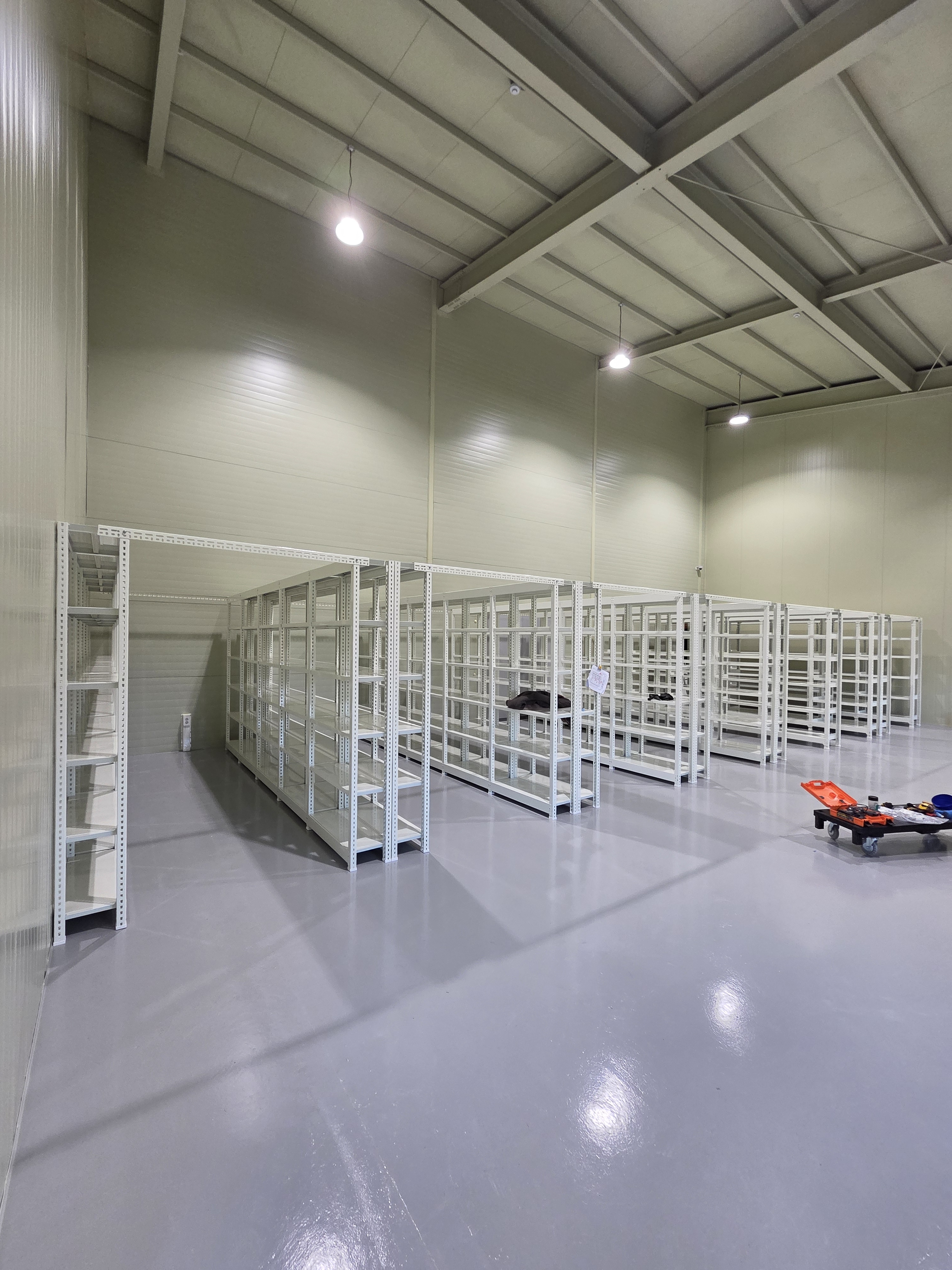 무거운 자재와 제품을 안정적으로 보관해야 하는 공간에 적합한 선반입니다.